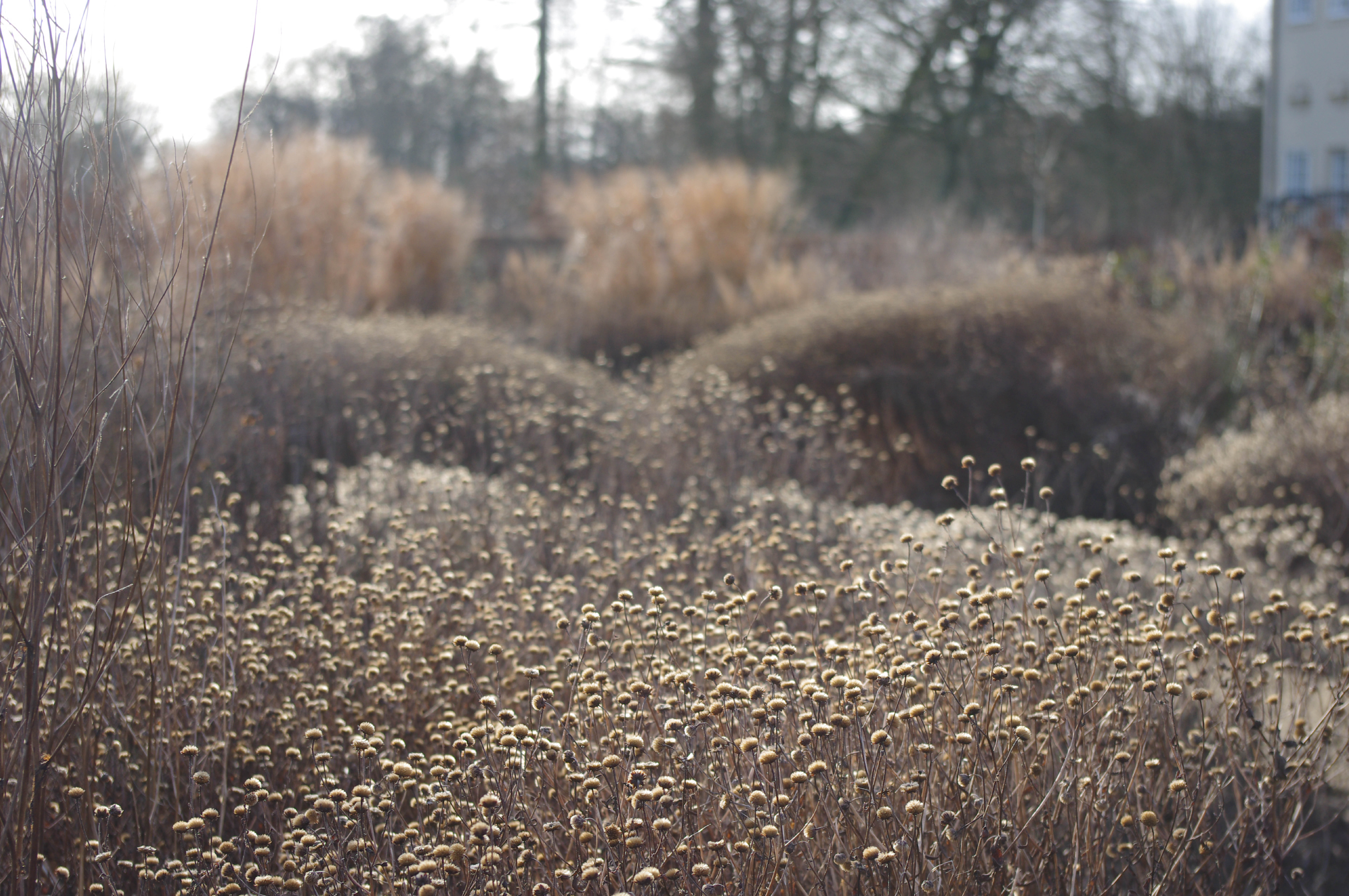 Ich liebe die schlanken vertikalen Linien von Salvias und Veronicastrums (Kandelaber-Ehrenreis) und die wuscheligen Samenköpfe aller Aster-Verwandten. Die Pompons an den Stängeln von Phlomis tuberosa 'Amazone' (Knollenbrandtkraut) bieten eine tolle Textur und Form und bilden einen guten Kontrast zu den klaren vertikalen Linien der flachen Blütenköpfe von Sedum (Fettehenne) und Achillea (Schafgarbe). Die klaren ovalen Umrisse der Teesorten sind wahrscheinlich das Auffälligste von allen, und dazwischen tanzen die runden, fast schwarzen Samenköpfe von Rudbeckia triloba. (Irgendwann im Laufe des Winters entdecken die Vögel diese Leckerbissen und plündern sie in wenigen Tagen, so dass die Rabatte in Aufregung gerät.